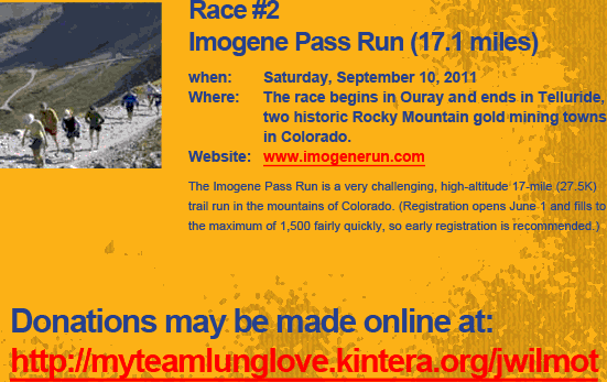 I have decided to dedicate my athletic endeavors to Jon and his family. I will run a number of trail events this year and aim to raise money for lung cancer awareness on behalf of the Wilmot family. My first race will be the Fear the Dear, a half marathon in Littleton, Colorado. This race is limited to 100 participants and is only 5 miles from Jon's house. My aim is to secure donations to Lung Cancer Alliance in Jon's name. Irun4you.org was created to allow people to run in honor of their friends or relatives who are battling disease. We can use this platform to build awareness and maximize our fund raising efforts. I have never had a friend or loved one face this type of battle and it has moved me immensely. Every day that I run, I think of Jon. He can't run anymore and he even has a hard time pushing Marlee's baby stroller. I want to do everything I can to make his life and recovery better. I want to do something to make a difference. It is a tragic twist of fate that this healthy athlete finds himself in a battle for his life with a new baby and a beautiful wife. If you know Jon, you understand why I am so committed to helping him. I'm hopeful that you will assist me in raising money or providing support for Jon and Leann, and the Lung Cancer Alliance. With great appreciation, Mike |